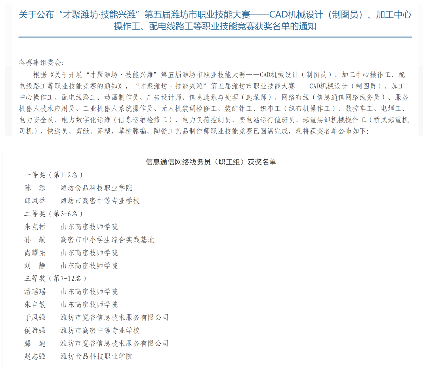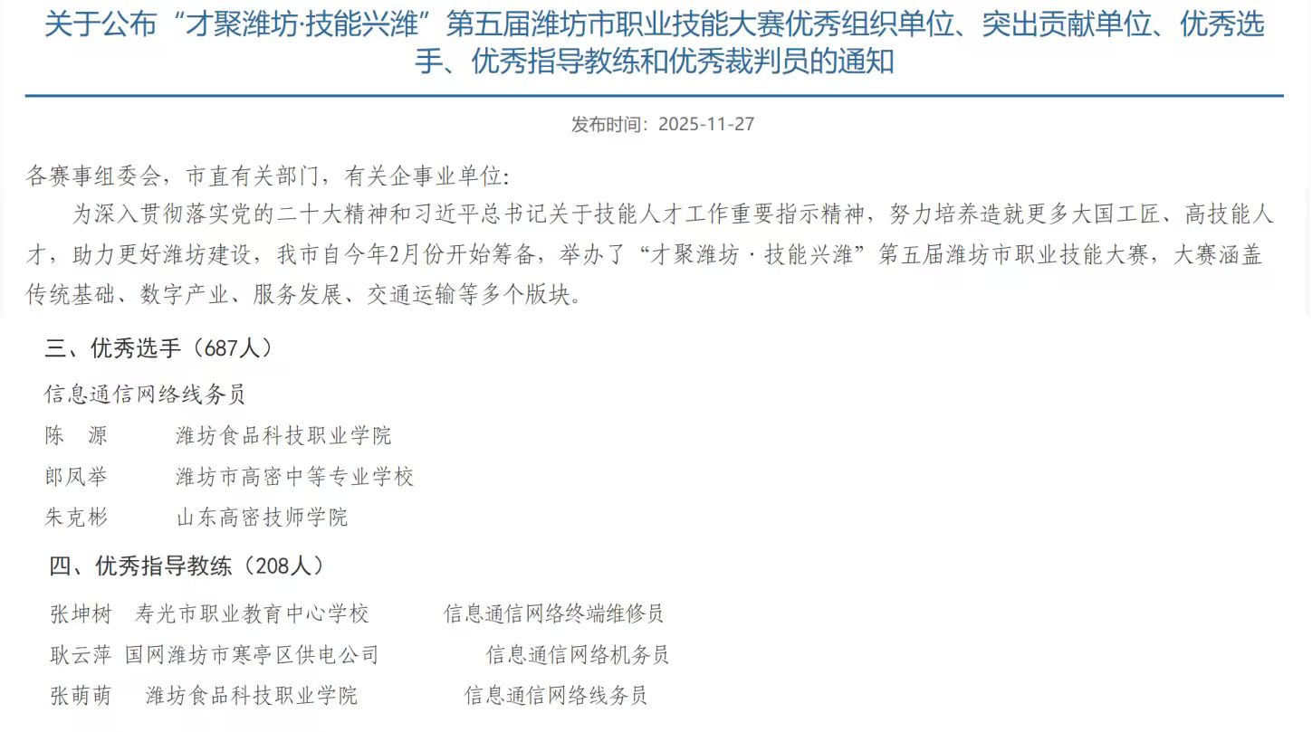 近日,在“才聚潍坊・技能兴潍”第五届潍坊市职业技能大赛中,工学院教师在信息通信网络线务员赛项中表现突出,荣获一等奖1项、三等奖1项,展现出扎实的专业技能与优秀的教学实践能力。