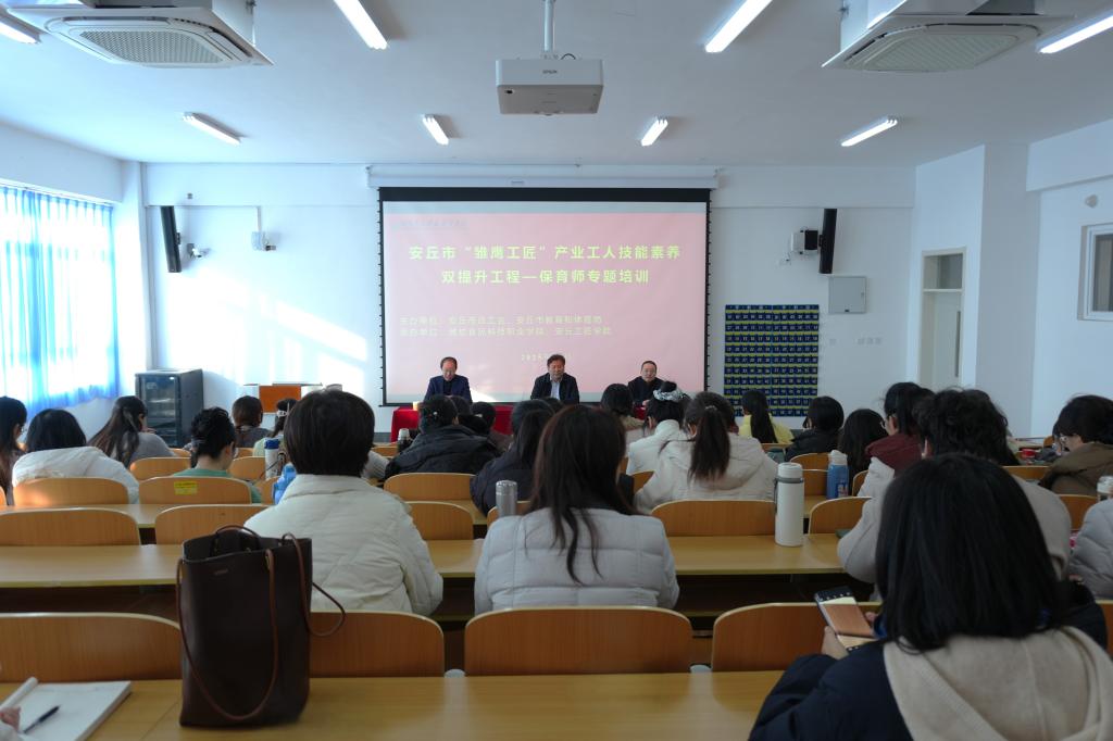 11月18日,由安丘市总工会和安丘市教育和体育局联合主办、我校继续教育学院承办的安丘市“雏鹰工匠”产业工人技能素养双提升工程—保育师专题培训班在我校顺利启动。安丘市总工会党组成员、副主席李伟,安丘市教育和体育局副局长韩文玉,潍坊食品科技职业学院党委副书记、工会主席张学东出席启动仪式,启动仪式由张学东主持。