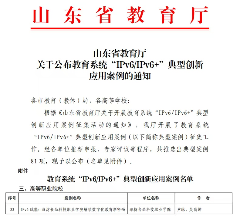 近日,山东省教育厅公布教育系统“IPv6/IPv6+”典型创新应用案例评选结果,我校申报的《IPv6赋能:潍坊食品科技职业学院解锁数字化教育新密码》成功入选,成为全省典型案例之一。