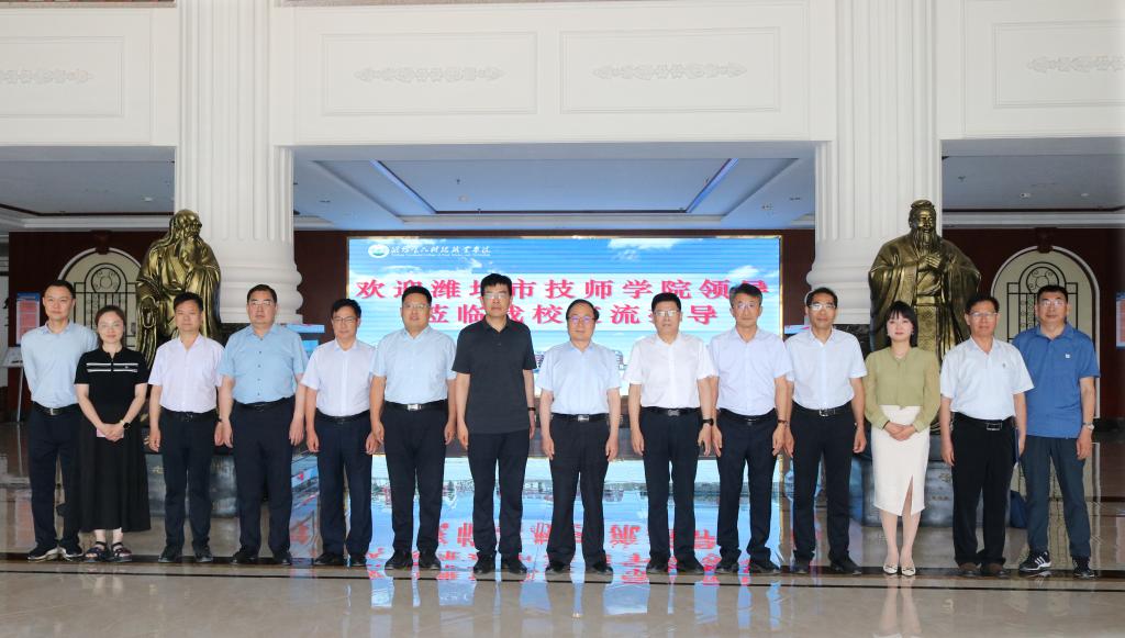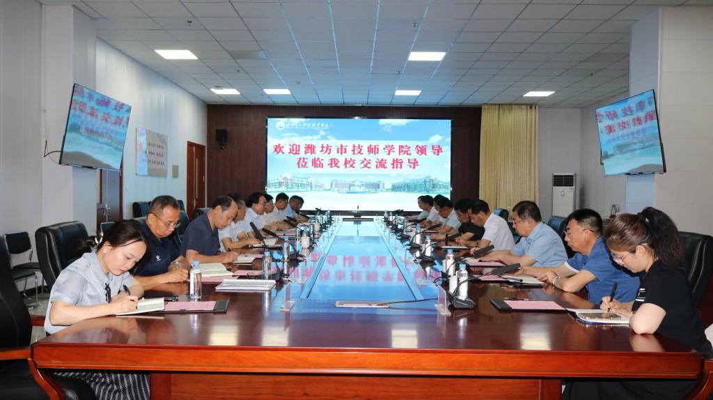 6月24日,潍坊市技师学院党委副书记、院长刘德强一行来我校调研交流。学校党委副书记、校长亓俊忠等校领导以及部分职能部门负责人和二级学院负责人参会。